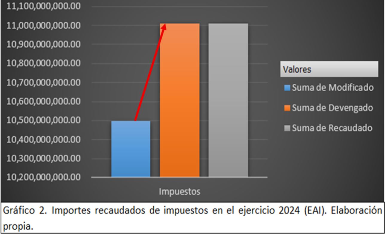El portal de transparencia no contiene ingresos a detalle por fuente de financiamiento, los reportes son muy generales, provocando que sólo podamos consultar la recaudación del rubro de impuestos, de tal suerte que, como se muestra en el gráfico 2, durante el ejercicio 2024, se reportó en el Estado Analítico de Ingresos de la Información Financiera del cuarto trimestre, que se recaudó 4.89% más de lo presupuestado, esto genera que se cuente con más recurso para aplicar en proyectos y programas prioritarios.