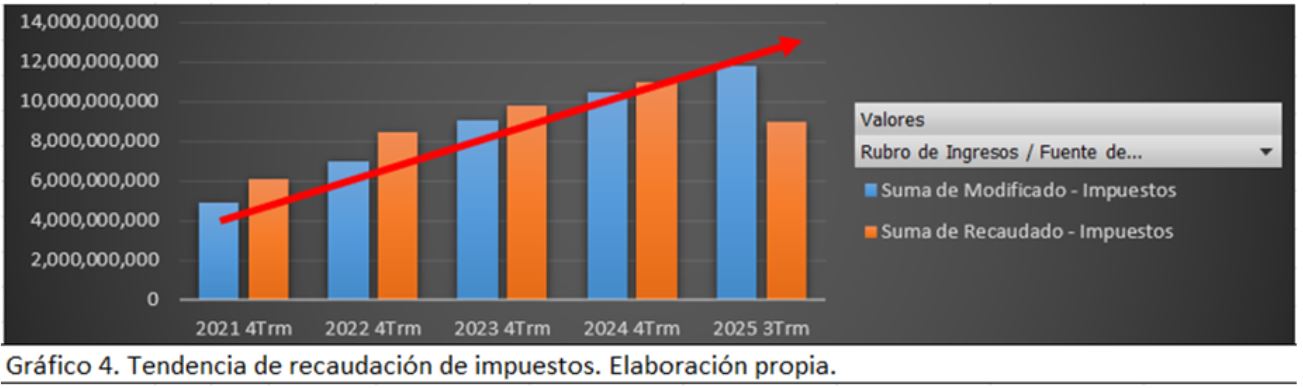 Para 2025 se consultó hasta el de septiembre del 2025, que es el corte del tercer trimestre que se reporta en los portales de transparencia, en donde encontramos que los ingresos recaudados son inferiores a lo pronosticado en un 24%, una brecha algo grande, pero que pudiera ser los ingresos del cuarto trimestre pensando de manera proporcional a que cada trimestre puede representar un 25%, sin embargo todo es hipotético y para tener un campo más amplio de la situación, podemos recurrir a la base de datos del reto 2 para ver su fluctuación en los cuatro años anteriores.